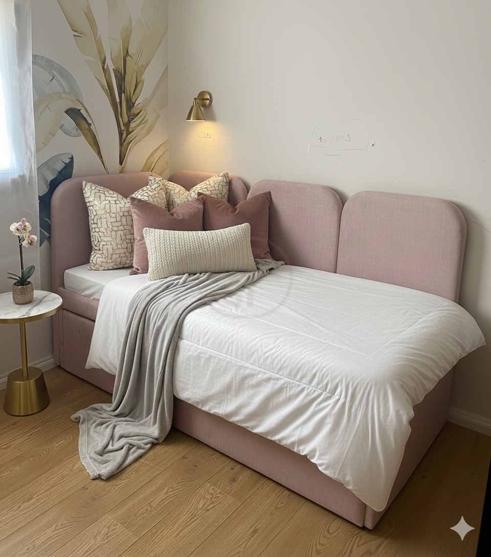 A beautifully designed high-riser bed( pullout plus raises) , customizable in any fabric and color.