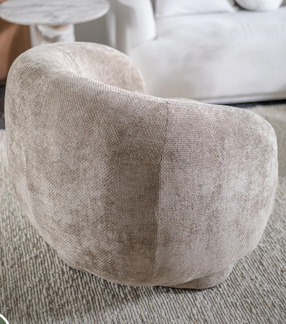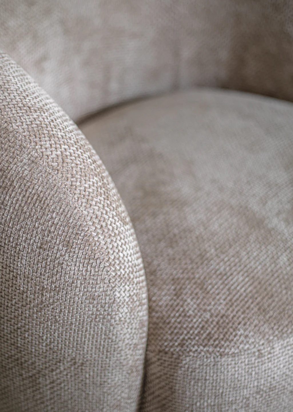 Sofia Swivel Armchair in Beige. A designer armchair featuring a plush, cubic seat and a wraparound backrest with a soft, rounded silhouette. A refined guest chair, perfect for placement in an entryway, waiting area, or modern hospitality spaces.